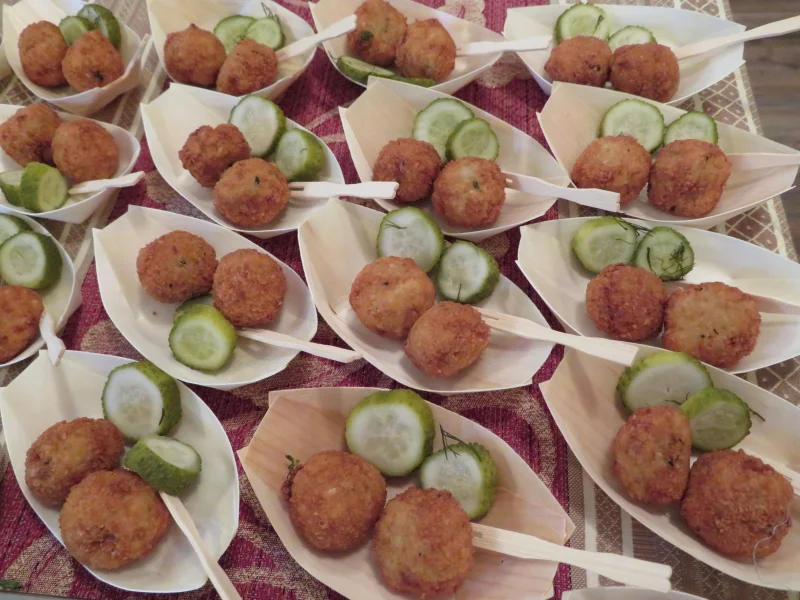 Keedetud kartul riivida suurema riiviga. Lisa kartul, kalahakkliha, maitsesegu ja muna omavahel. Sega kuni kalapalli mass on parajalt tihke, et vormida kalapallid. Paneeri kalapallid riivsaias ja küpseta õlis kuldpruuniks.